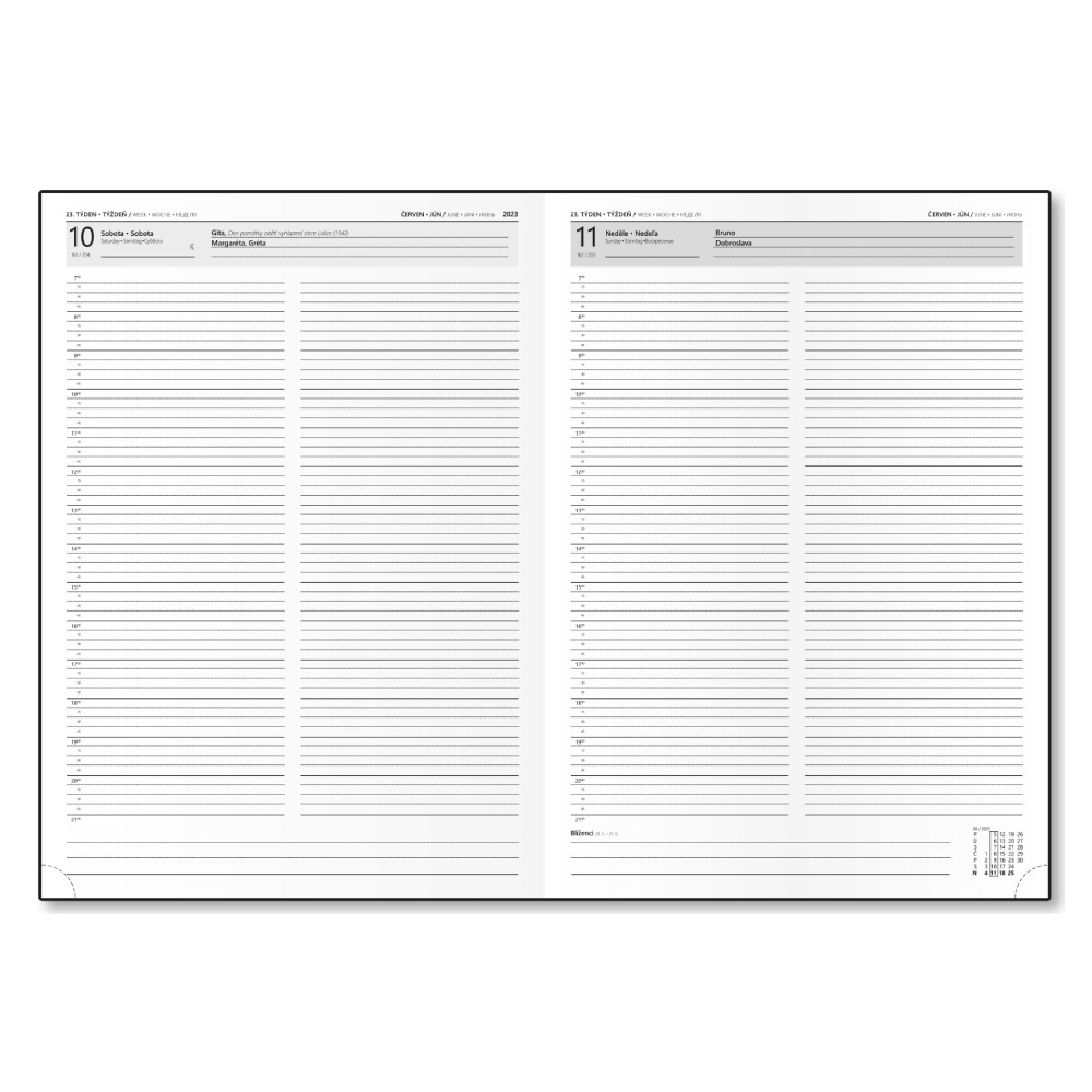 Calendarium: daily Czech and Slovak with names (Sat/Sun separately on the page)