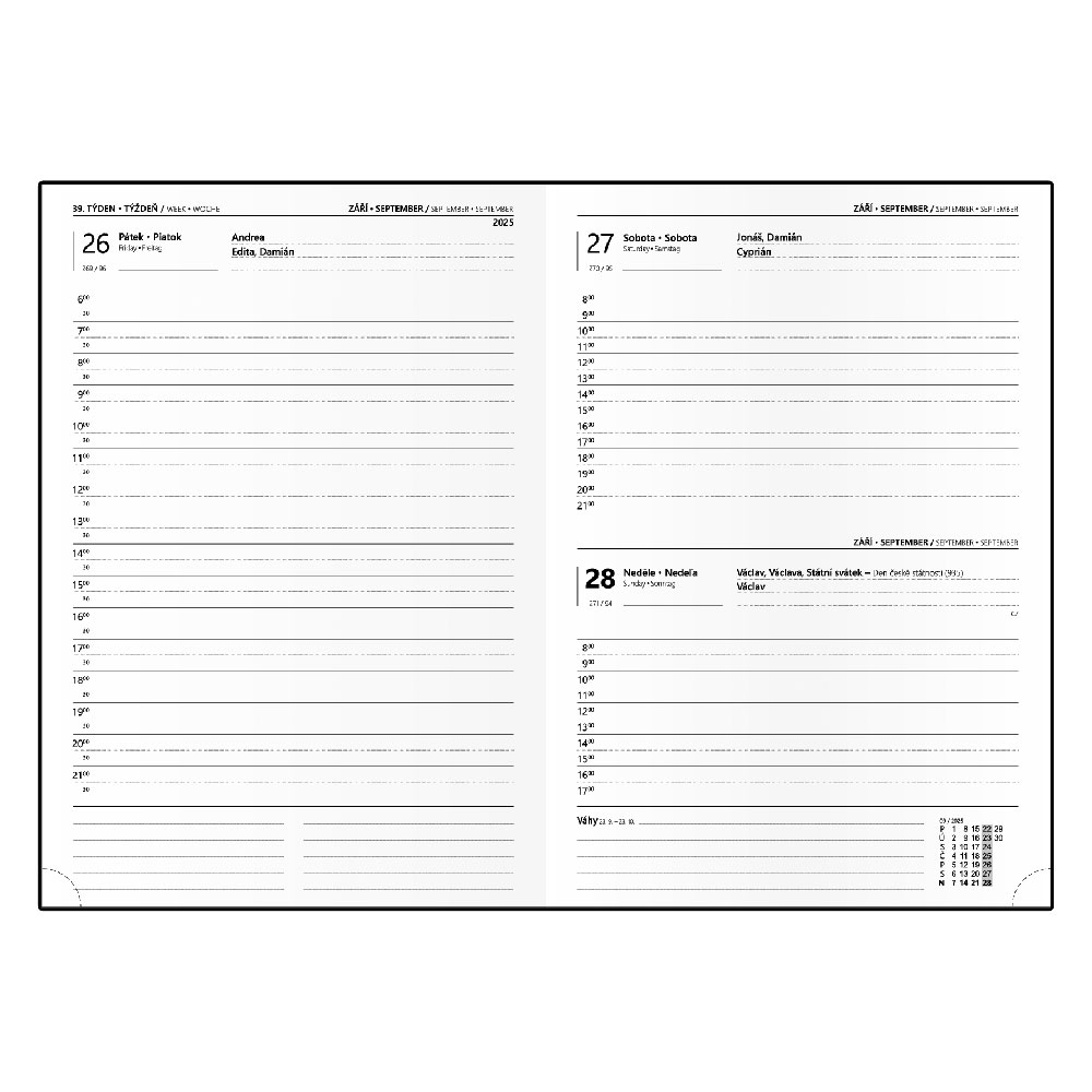 Dimension: 143 x 205 mm Format: A5 Calendar: daily Czech and Slovak nominal Language mutations: CZ, SK, EN, DE Cover material: soft smooth material Paper: white with perforated rolls Number of pages: 352 Binding: stitched V8 binding Bookmark: white ribbon