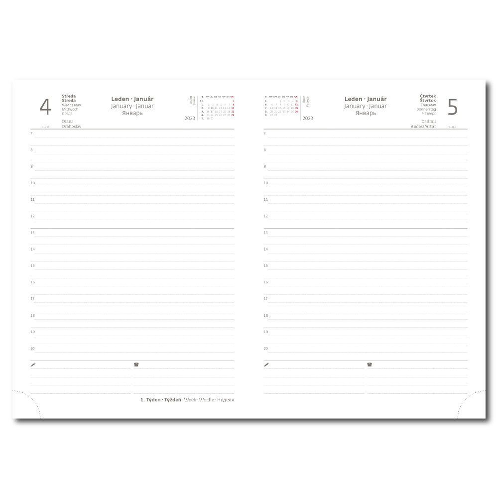 Size: 143 x 205 mm Format: A5 Calendarium: daily Czech/Slovak Number of Pages: 352 Pages Block color: white Binding: V8 Cover material: matt smooth leatherette Contains: personal data, holiday planner (monthly overview), planning calendar, telep