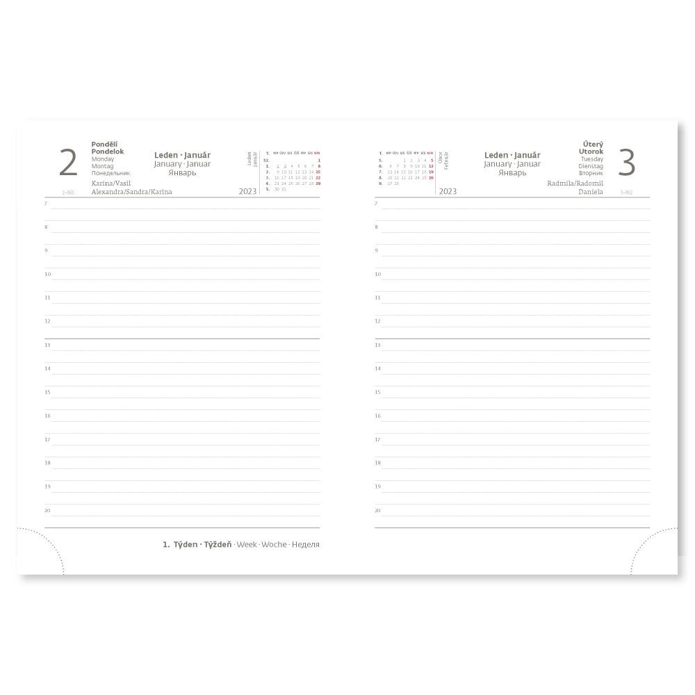 Size: 120 x 165 mm Format: B6 Calendarium: denní Number of Pages: 352 Block color: white Binding: V8 Cover material: matt leatherette Contains: personal data, holiday planner (monthly overview), planning calendar, telephone prefixes, public holi