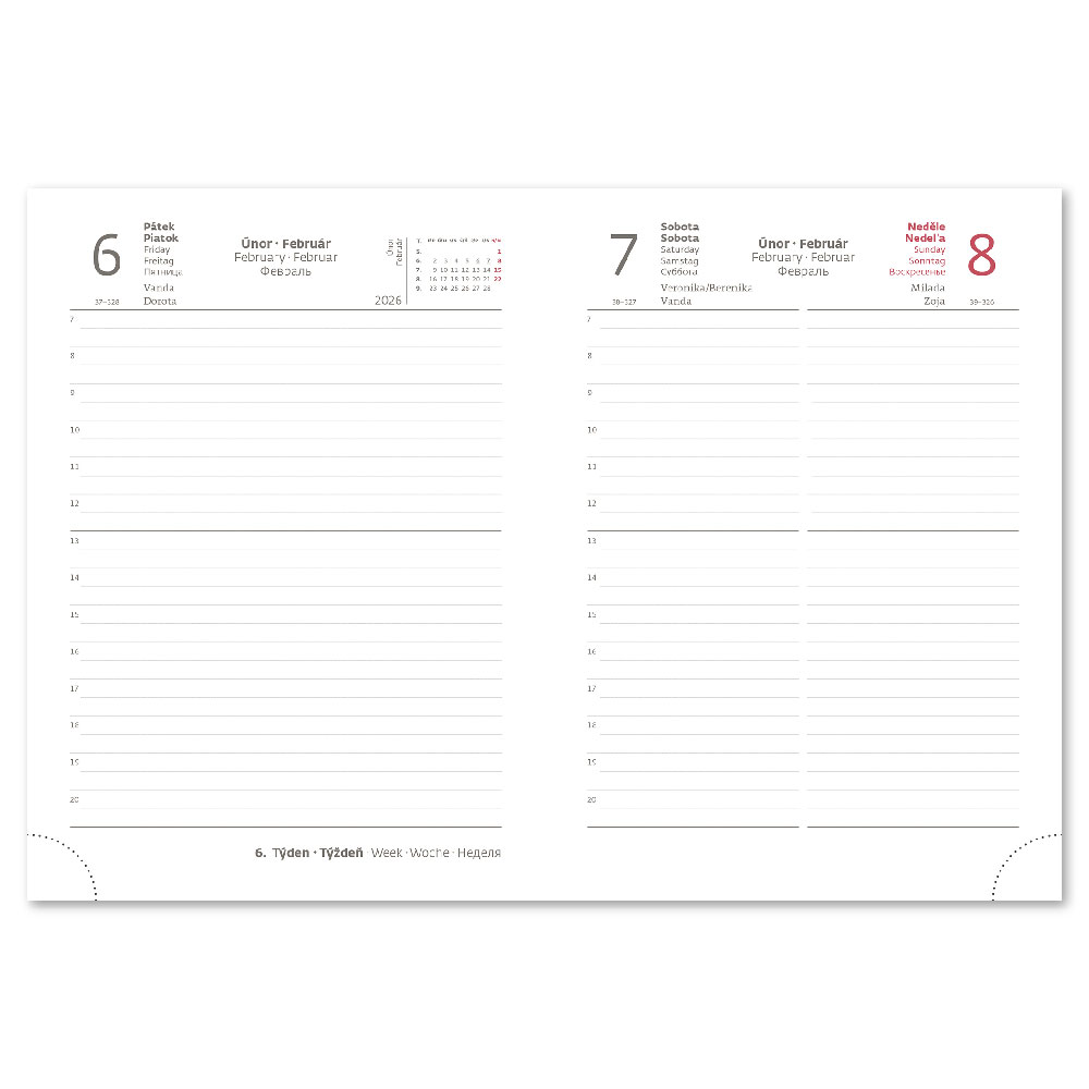 Size: 120 x 165 mm Format: B6 Calendarium: daily Czech/Slovak Number of Pages: 336 Block color: white Binding: V8 Cover material: lamination with silk effect Contains: personal data, holiday planner (monthly overview), planning calendar, telephon