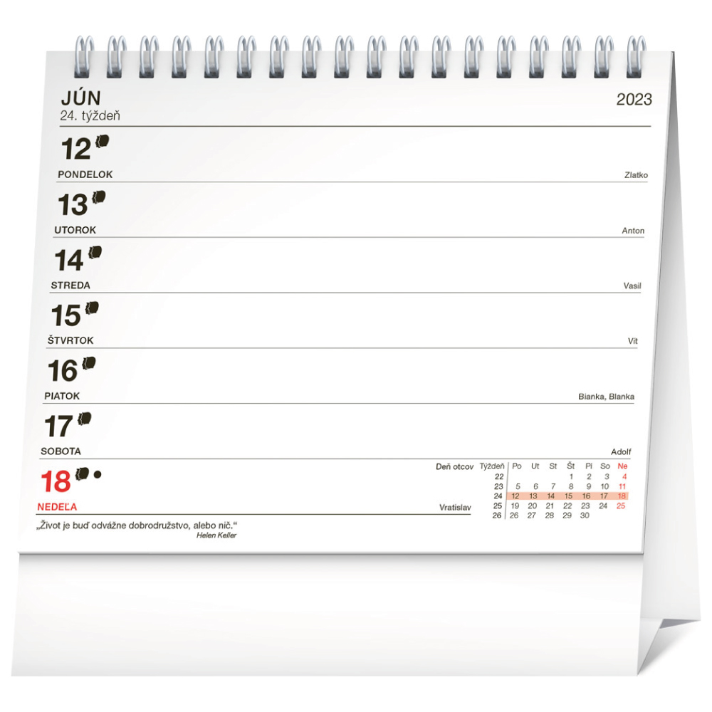 Size: 16,5 x 13 cm Calendarium: slovak weekly Number of pages: 29 sheets (double-sided printing) Binding: Twin Wire Paper: 100 g/m2 Advertising space: 16,5 x 2,9 cm