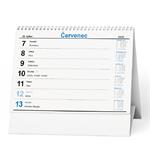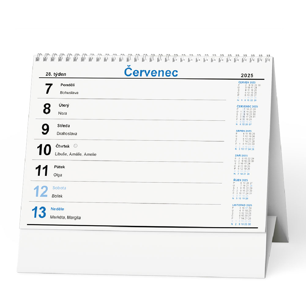 Dimension: 210 x 150 mm Calendar: Czech weekly name calendar Calendar extent: 57 pages Binding: Twin Wire split metal spiral Stand: A-shaped Paper: chalk gloss Area for printing: 210 x 35 mm Includes: moon phases, seasons, summer and winter time, tabular