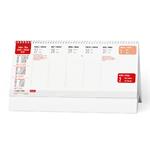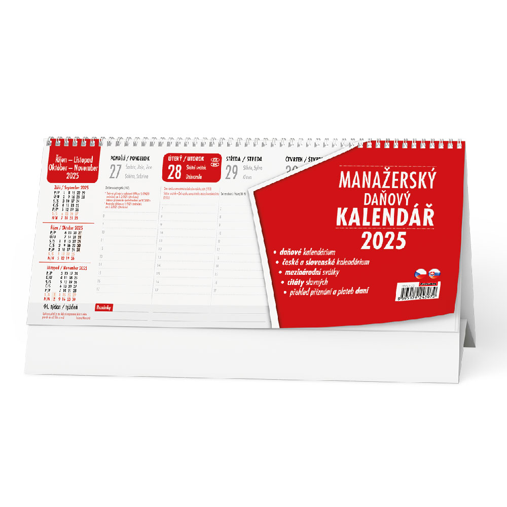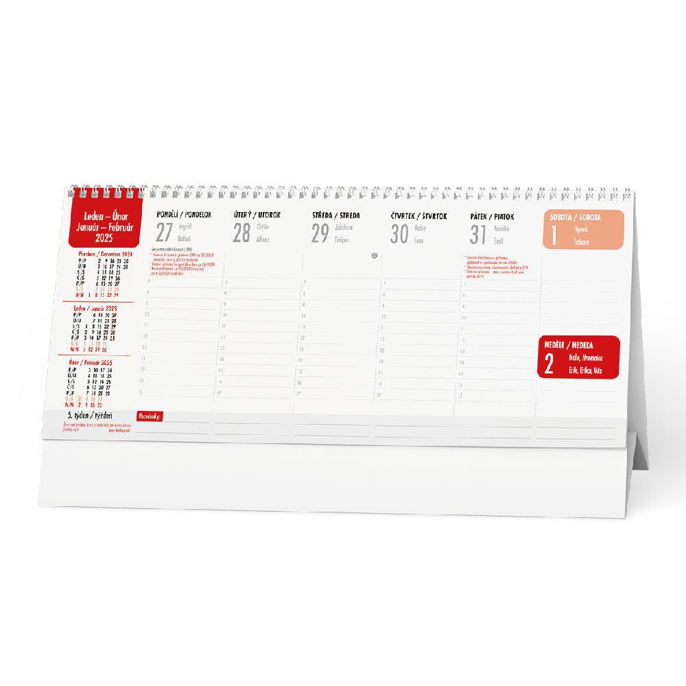 Dimension: 320 x 140 mm Calendar: Czech and Slovak weekly name calendar Calendar extent: 58 pages Binding: Twin Wire split metal spiral Stand: A-shaped Paper: chalk gloss International holidays: CZ,SK,PL,A,D Area for printing: 320 x 35 mm Includes: moon