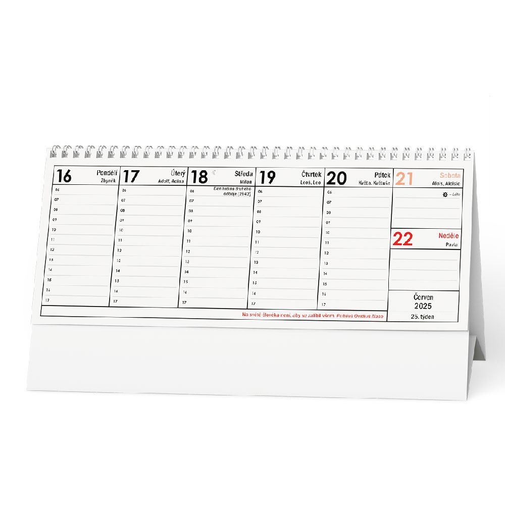 Dimension: 240 x 98 mm Calendar: Czech weekly name calendar Calendar extent: 57 pages Binding: Twin Wire split metal spiral Stand: A-shaped Paper: chalk gloss Area for printing: 240 x 35 mm Includes: moon phases, seasons, summer and winter time, quote fo