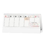 Dimension: 285 x 104 mm Calendar: Czech weekly name calendar Calendar extent: 57 pages Binding: Twin Wire split metal spiral Stand: A-shaped Paper: chalk gloss Area for printing: 285 x 35 mm Includes: moon phases, seasons, summer and winter time, tabular