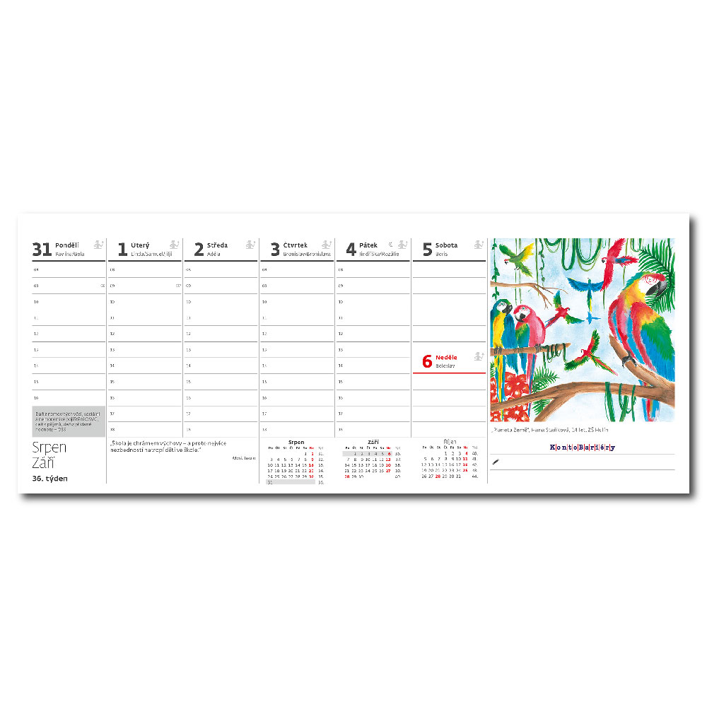 Size: 32,1 x 13,4 cm Calendarium: Czech weekly column with names Number of Pages: 60 + 2 Pages Binding: Twin wire Advertising space: 32,1 x 3,5 cm
