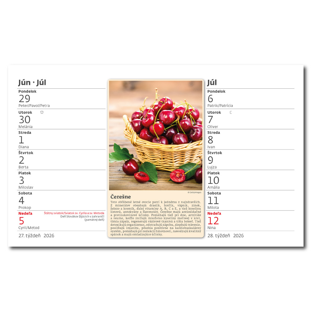 Size: 22.6 x 13.9 cm Calendar: Slovak two-week line nominal Calendar range: 28 + 2 pages Stand: lock Binding: Twin Wire Printing area: 22.6 x 3 cm