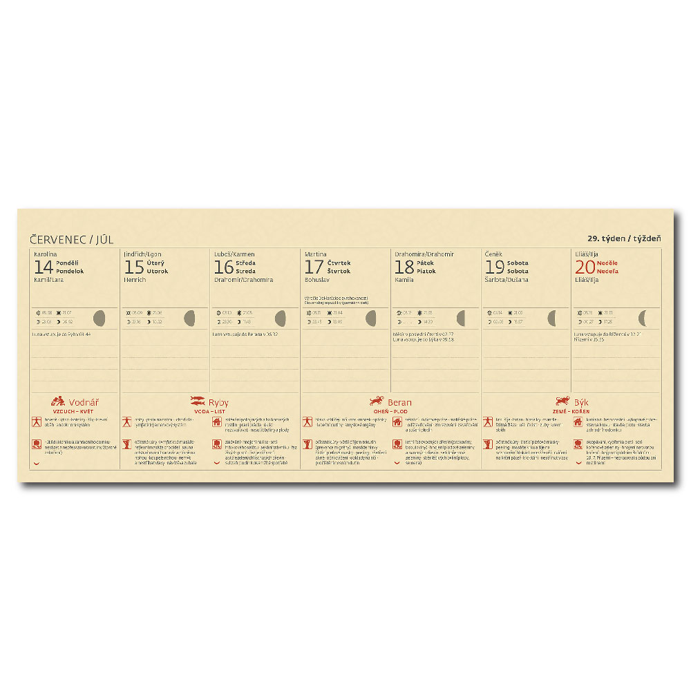 Size: 32.1 x 13.4 cmCalendar: Czech/Slovak Weekly columnar with namesCalendar range: 60 + 2 pagesStand: lockableBinding: Twin WirePrint area: 32.1 x 3.5 cm