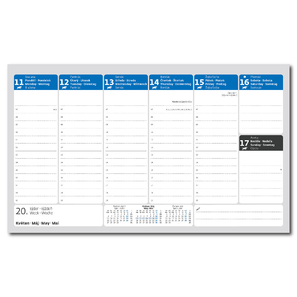 Size: 30,1 x 18 cm Calendarium: Czech/Slovak weekly column with names + EN + DE Number of Pages: 60 + 2 Pages Binding: Twin wire Advertising space: 30,1 x 3,5 cm