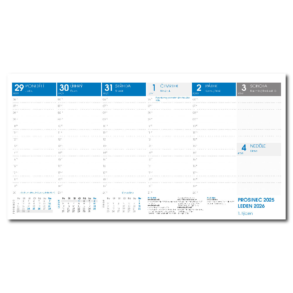 Dimension: 290 x 207 mmCalendar: weekly Czech taxRange: 60 sheetsArea for printing: 290 x 55 mm
