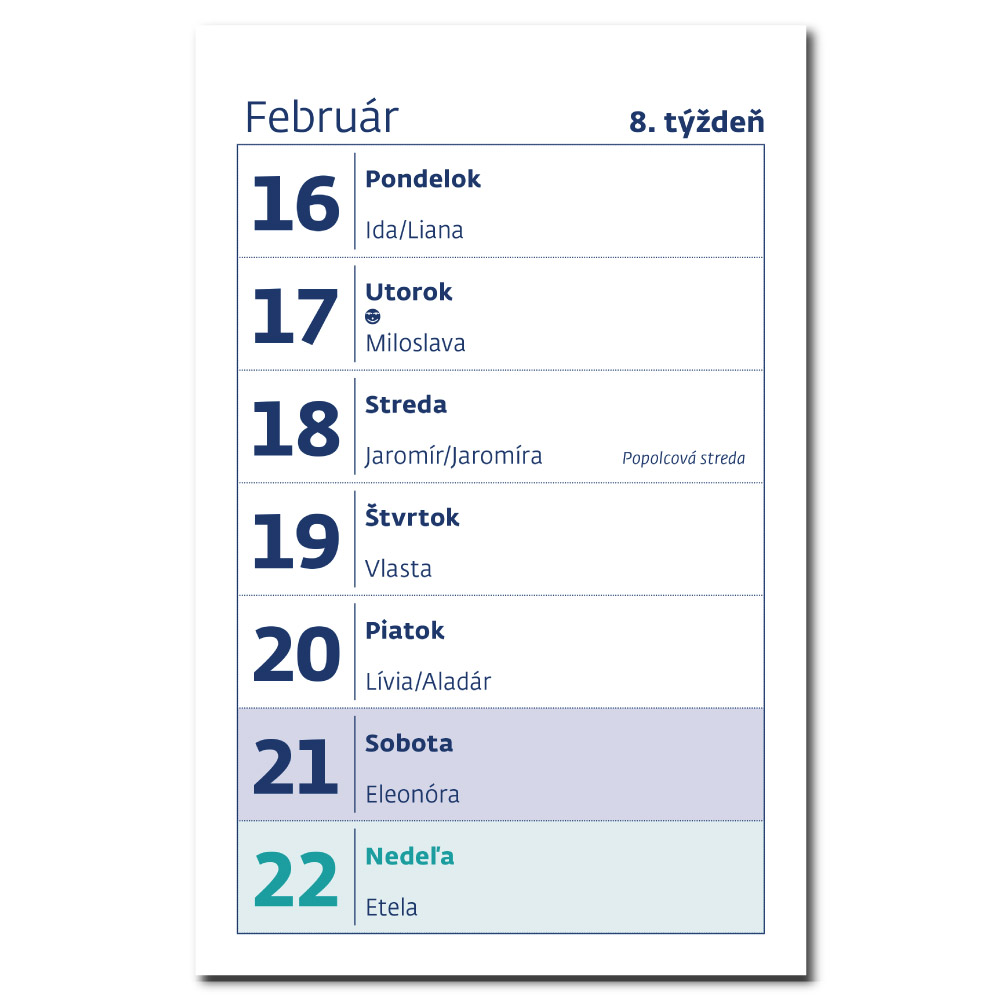 Size: 9 x 14 cm Calendar: Slovak weekly line name Binding: Twin Wire Stand: lock Number of pages: 56 + 2 pages Printing area: 9 x 2.5 cm
