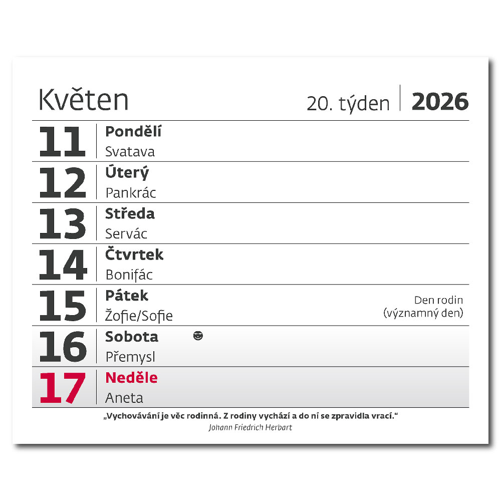 Size: 17,1 x 13,9 cm Calendarium: Czech Weekly Line with names with quotes Number of Pages: 56 + 2 Pages Binding: Twin wire Advertising space: 17,1 x 2,5 cm