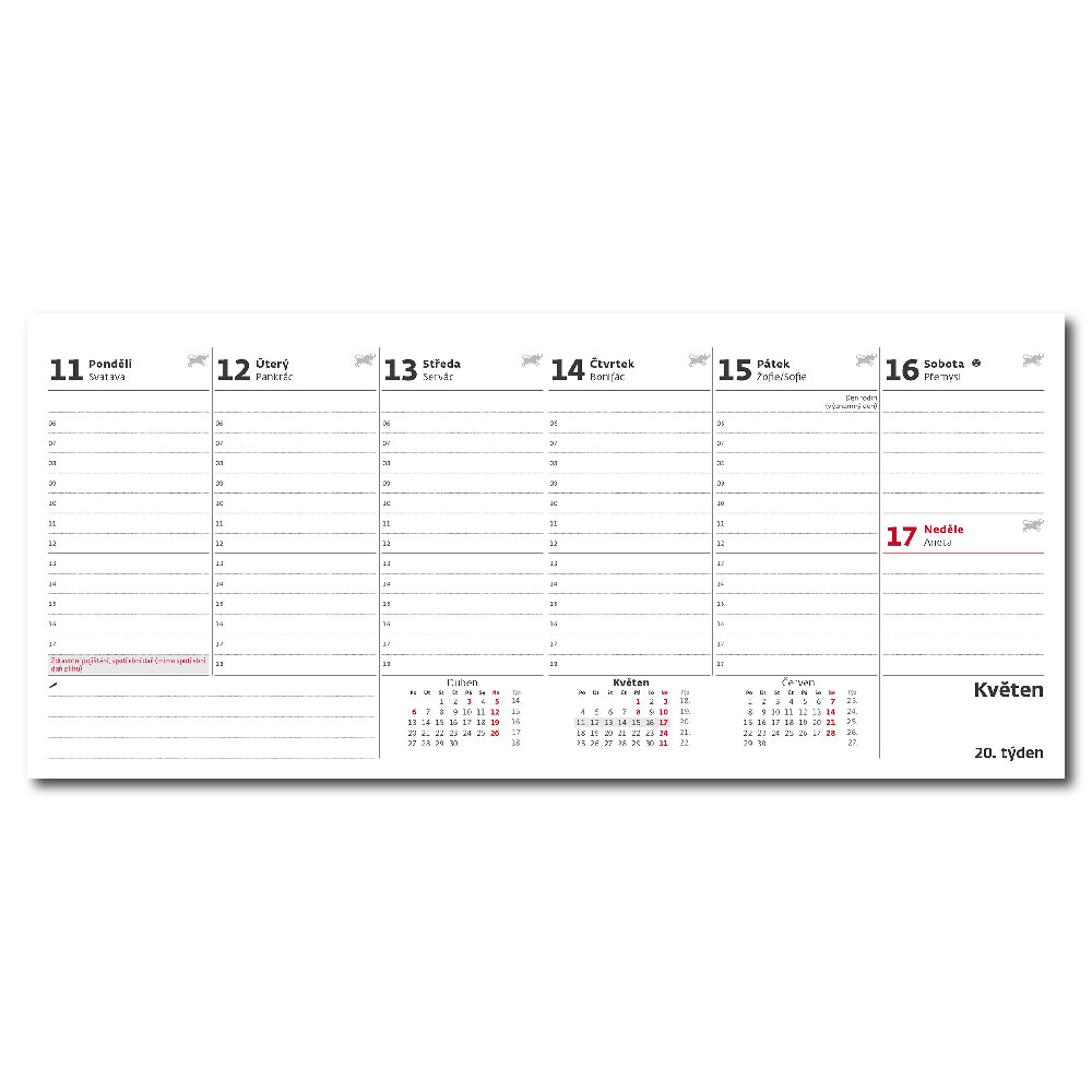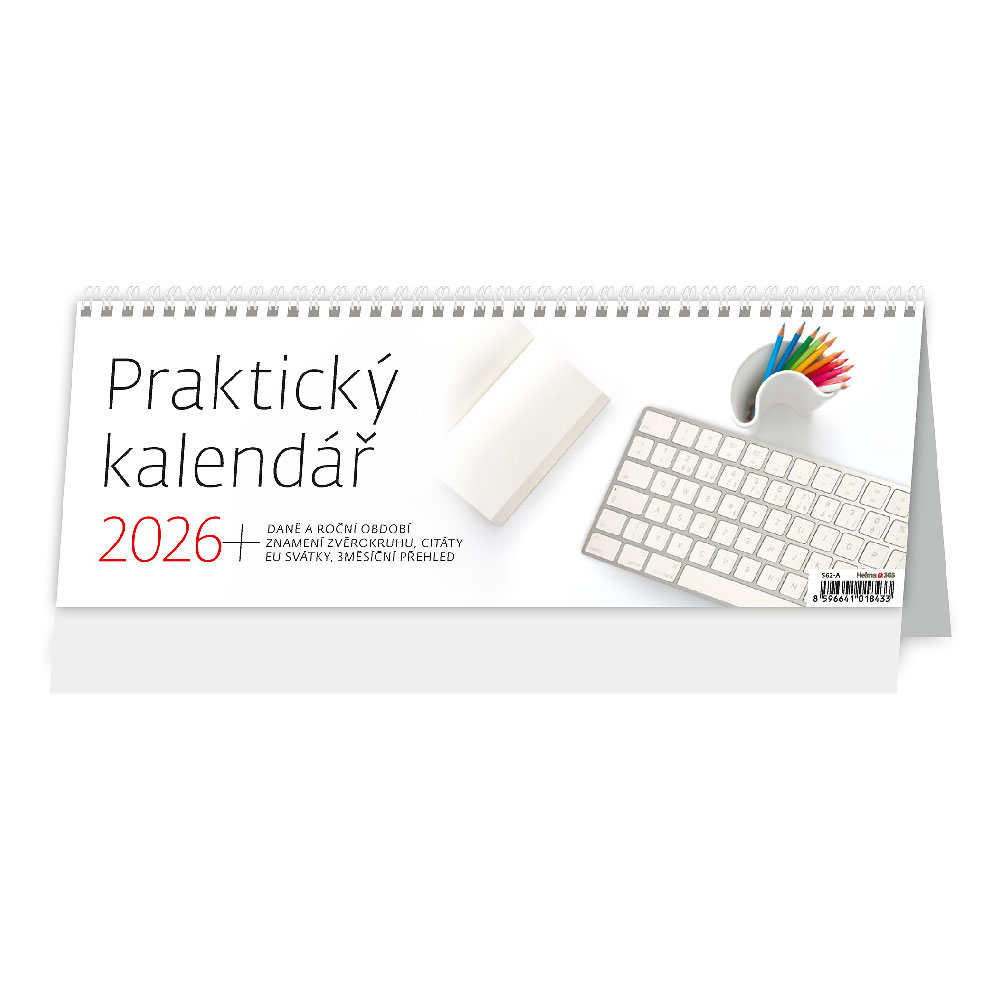 Size: 33,6 x 12,1 cmCalendarium: Czech weekly column with names Number of Pages: 64 + 2 PagesBinding: Twin wireAdvertising space: 33,6 x 3,5 cm