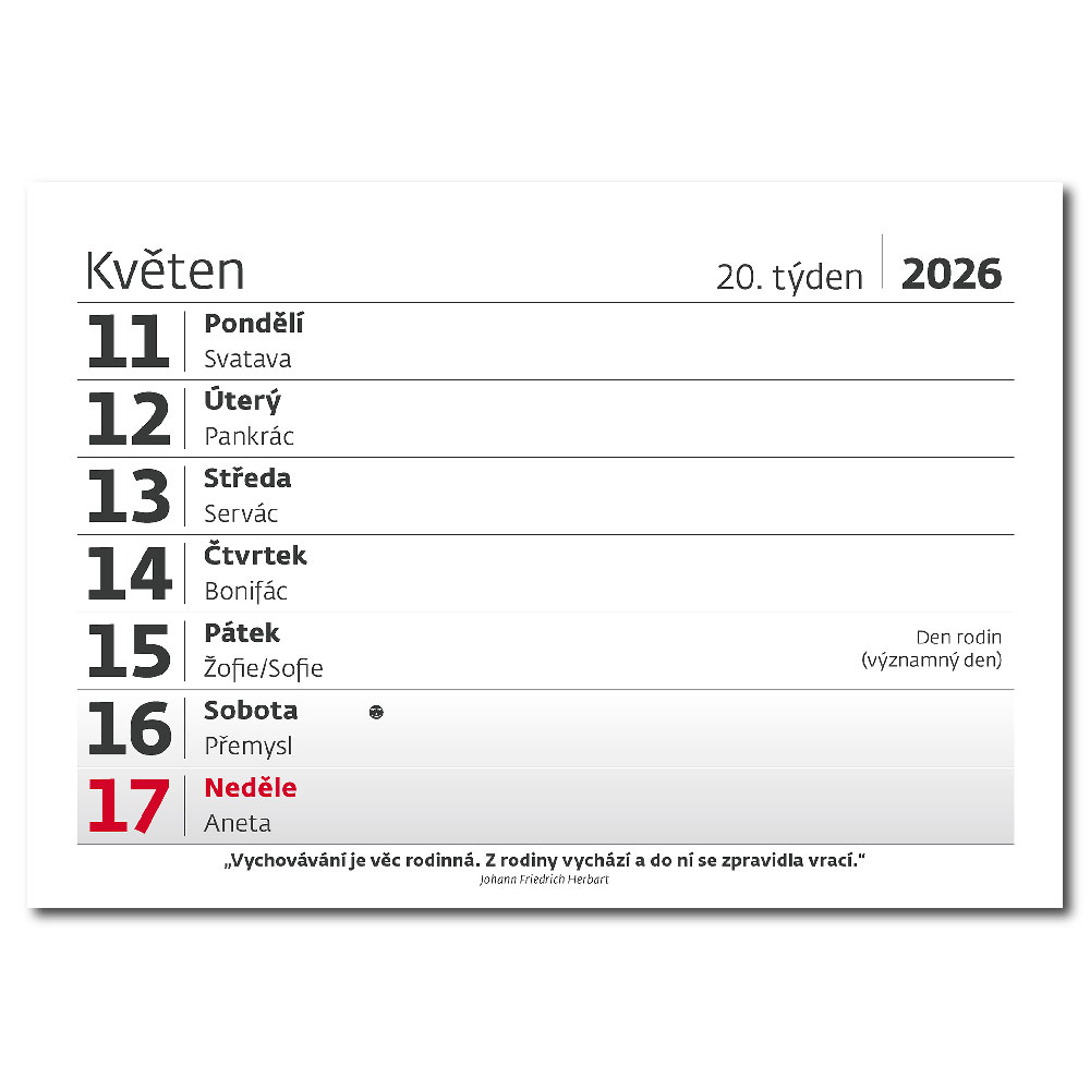 Size: 21,1 x 14,8 cm Calendarium: Czech Weekly Line with names Number of Pages: 54 + 2 Pages Binding: Twin wire Advertising space: 21,1 x 3 cm