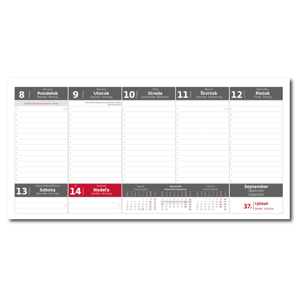 Size: 32 x 16 cm Calendar: Slovak weekly column nominal + AJ + NJ Calendar range: 60 + 2 pages Stand: lock Binding: Twin Wire Printable area: 32 x 3.5 cm Contains: taxes and seasons, EU holidays, 3-month overview.