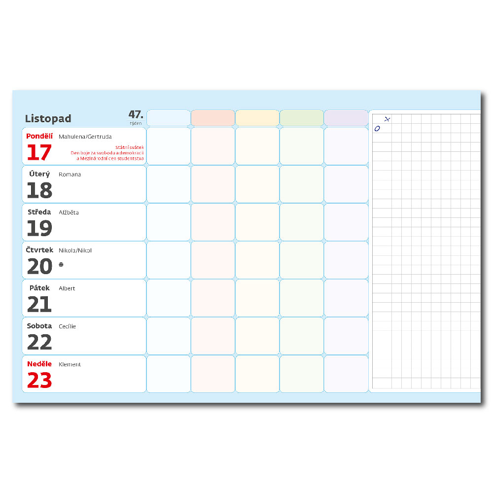 Size: 24 x 16 cm Calendarium: Czech Weekly Line with names Number of Pages: 64 + 2 Pages Binding: Twin wire Advertising space: 24 x 3 cm