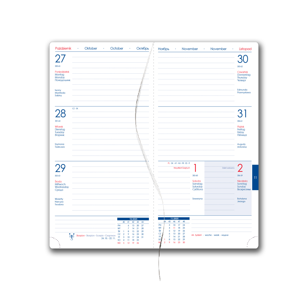 Format: pocket Block Size: 80 x 150 mm Number of pages: 144 pages Binding: sewn V8 Calendarium: weekly Polish with names Languages: PL, EN, DE, RU Block color: white Font color: blue and red Diary contains: tear-off corners, white bookmark pen loop, pen