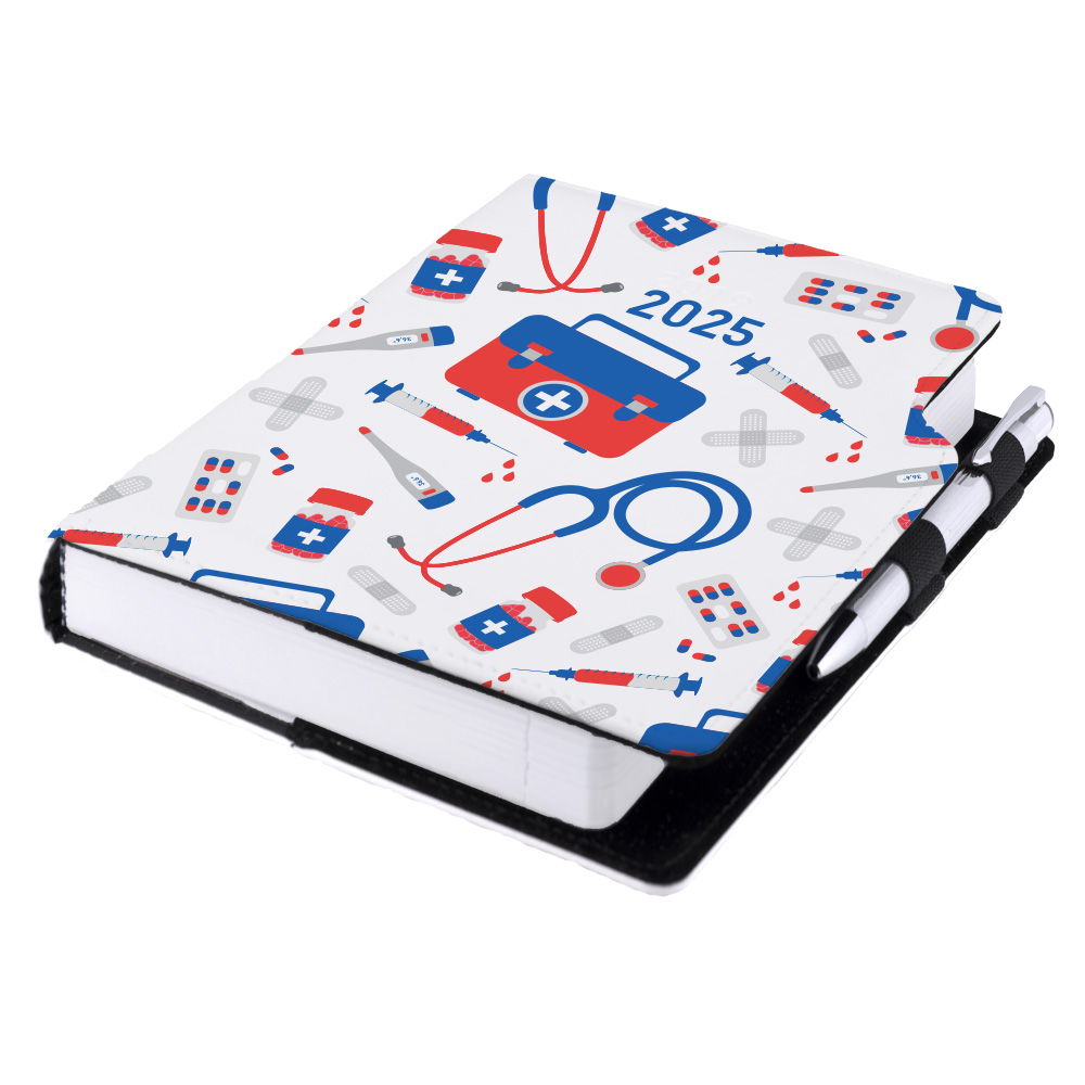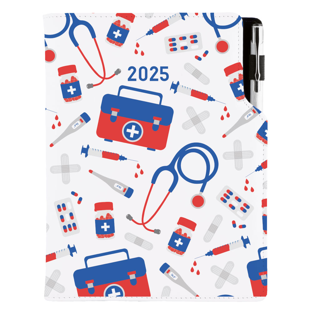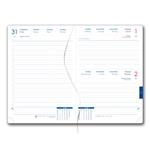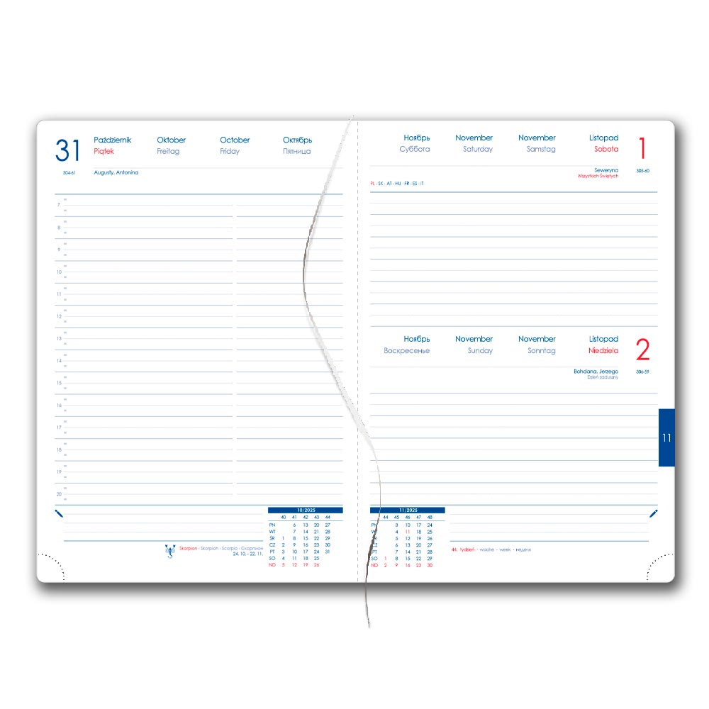 Format: A5 Block Size: 143 x 206 mm Number of pages: 348 Binding: stapled V8 Dates: daily Polish (Saturday and Sunday on a separate page) Languages: PL, EN, DE, RU Color of the Block: white Font Color: blue and red Diary contains: tear-off corners, white