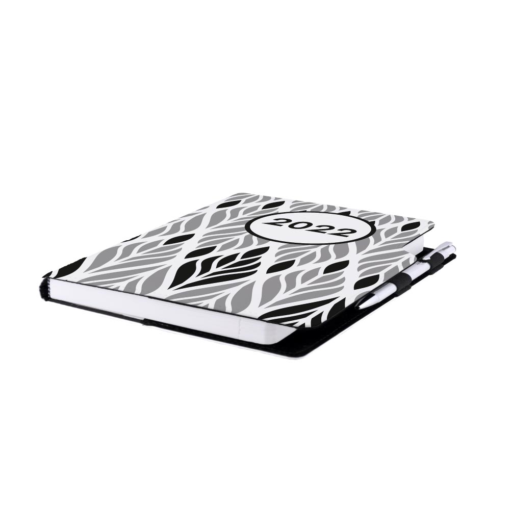 Diary contains: tear-off corners, white bookmark and pen