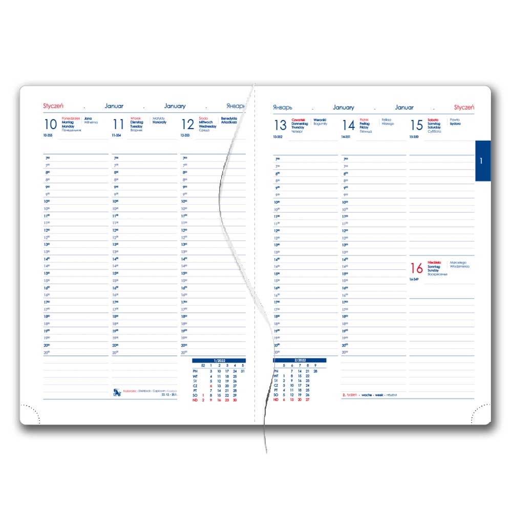 Format: A5 Block Size: 143 x 206 mm Number of pages: 140 Binding: stapled V8 Calendarium: weekly Polish with names Languages: PL, EN, DE, RU Color of the Block: white Font Color: blue and red Diary contains: tear-off corners, white bookmark and p