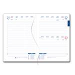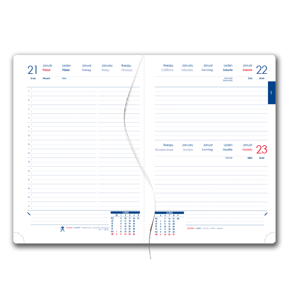 Format: A5 Block Size: 143 x 206 mm Number of pages: 354 Binding: stapled V8 Calendarium: daily Slovak with names Languages: SK, CZ, EN, DE, RU Color of the Block: white Font Color: blue and red Cover Material: patterned leatherette Diary conta