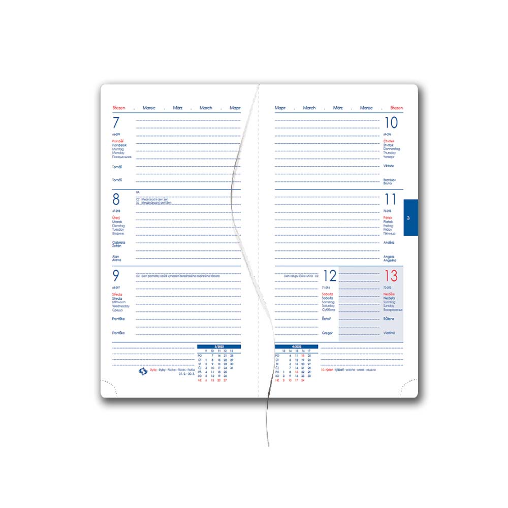 Format: pocket Block Size: 80 x 150 mm Number of pages: 140 Binding: stapled V8 Calendarium: weekly Czech with names Languages: CZ, SK, EN, DE, RU Color of the Block: white Font Color: blue and red Cover Material: patterned leatherette Diary con