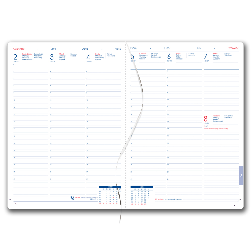 Diary contains: tear-off corners, white bookmark and pen