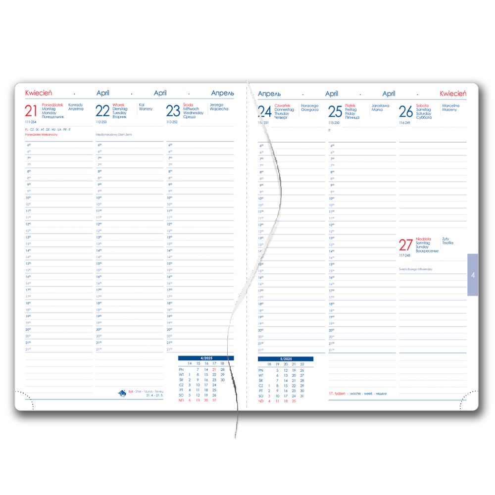 Format: B5 Block Size: 170 x 250 mm Number of pages: 140 pages Binding: sewn V8 Calendarium: weekly Polish with names Languages: PL, EN, DE, RU Block color: white Font color: blue and red Diary contains: tear-off corners, white bookmark and pen Outer ma