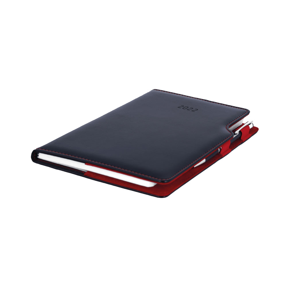 Diary contains: tear-off corners, white bookmark and pen