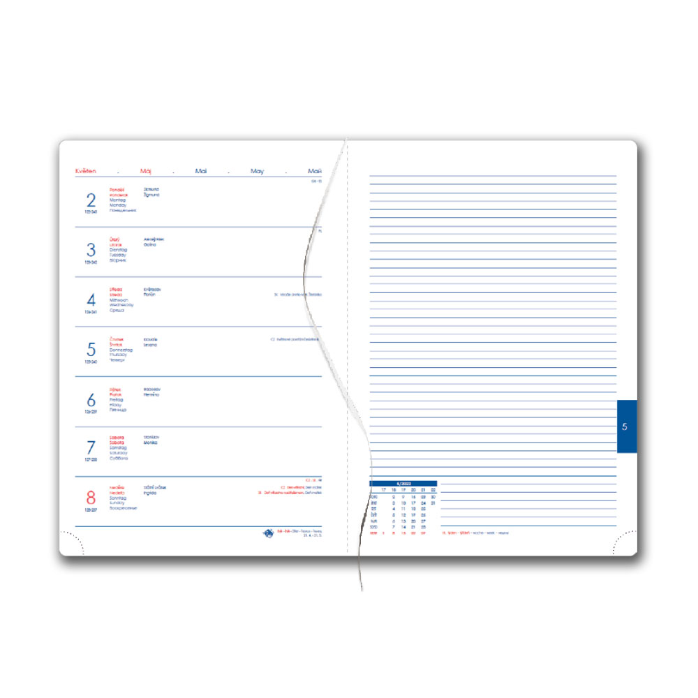 Calendarium: weekly CZ/SK with names + whole page for notes