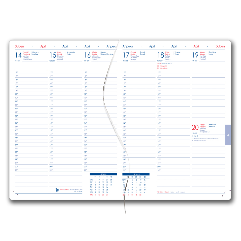 Format: A5 Block Size: 143 x 205 mm Number of pages: 142 Binding: stapled V8 Calendarium: weekly Czech with names Languages: CZ, SK, EN, DE, RU Color of the Block: white Font Color: blue and red Diary contains: tear-off corners, white bookmark,