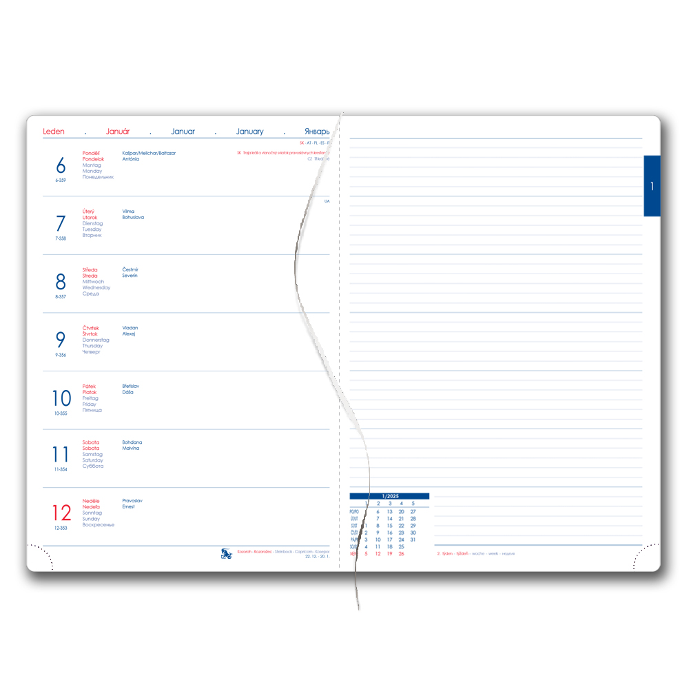 Calendarium: weekly CZ/SK with names + whole page for notes