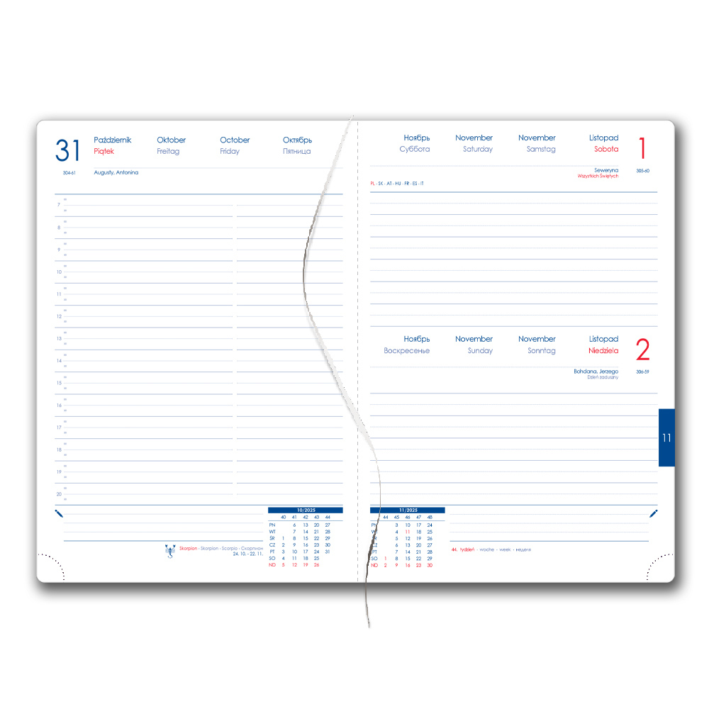 Format: A5 Block Size: 143 x 205 mm Number of pages: 348 Binding: stapled V8 Calendarium: daily Polish with names Languages: PL, EN, DE, RU Color of the Block: white Font Color: blue and red Diary contains: tear-off corners and white bookmark Outer mate