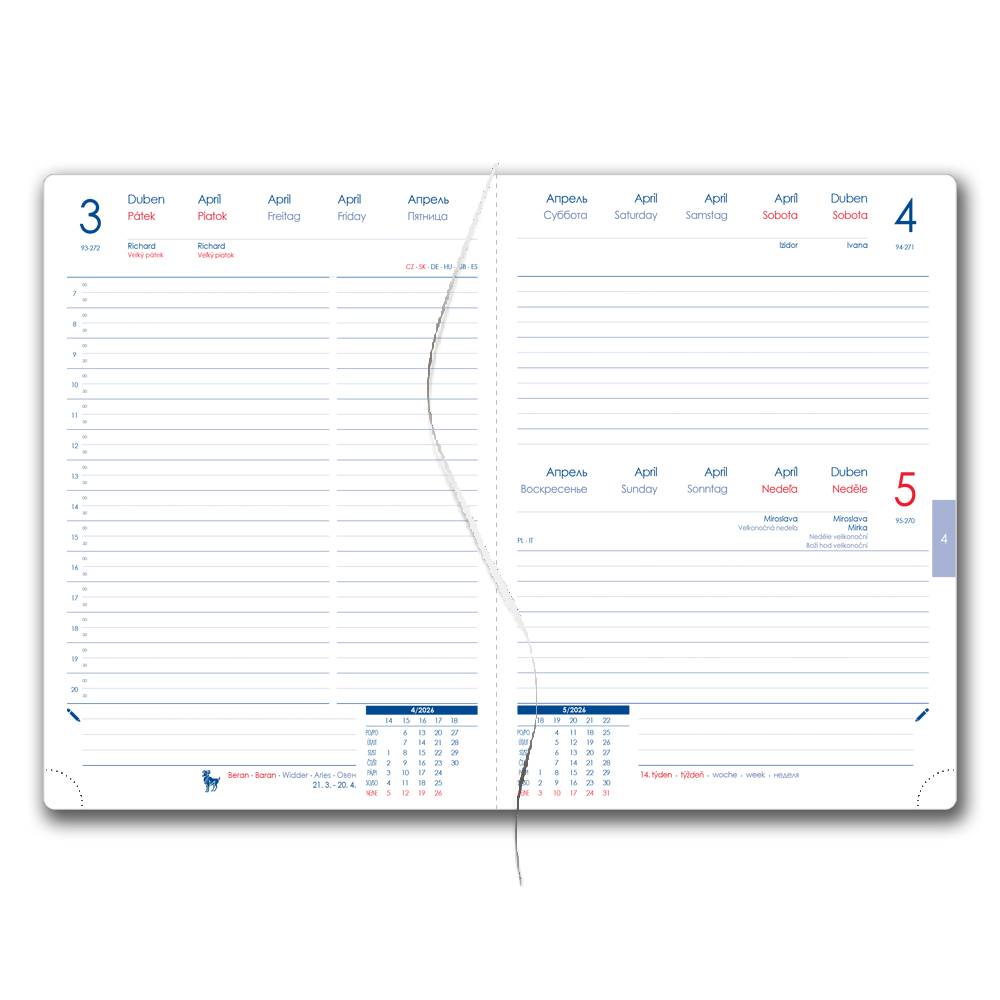 Format: B6 Block size: 120 x 165 mm Number of pages: 352 Binding: stapled V8 Calendarium: daily Czech and Slovak with names Languages: CZ, SK, EN, DE, RU Block color: white Font color: blue and red Diary contains: tear-off corners, white bookmark