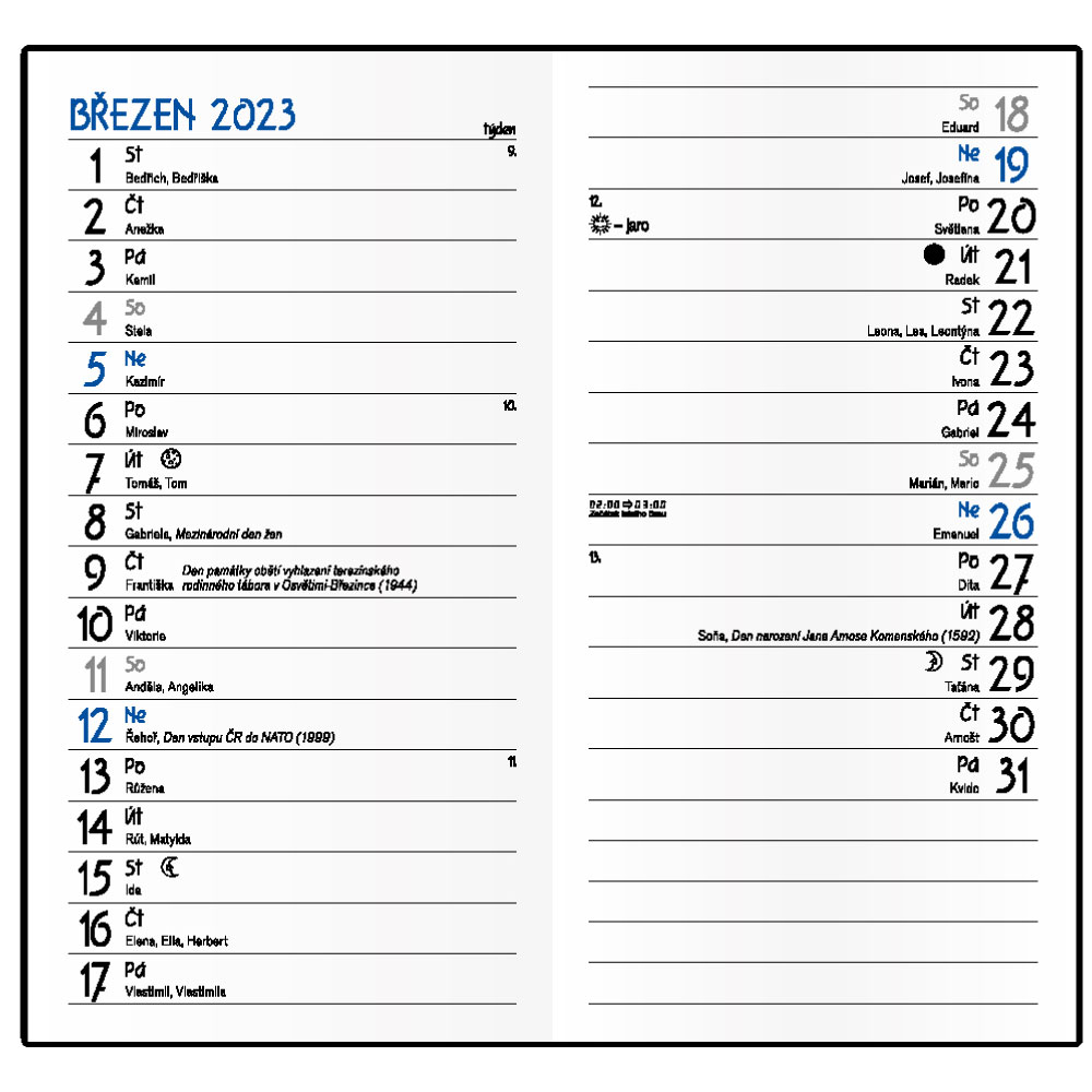 Size: 90 x 150 mm Format: pocket Calendarium: monthly school Czech with names (Semptember 2022 - August 2023) Cover material: matt laminate coated with printed graphics Paper: white Number of pages: 32 Binding: sewn binding V1 Calendar contains: