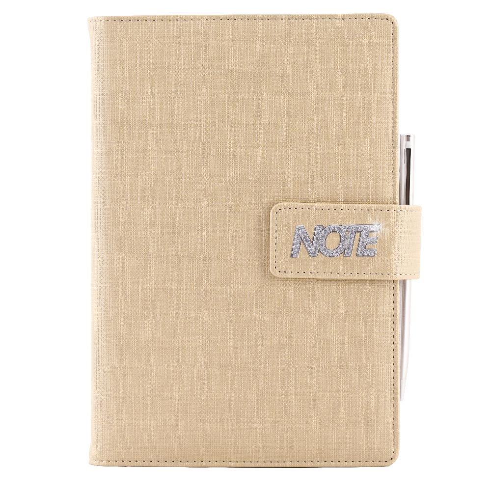 Format: A5 Size: 143 x 205 mm Material cover: leatherette Binding: sewn V8 Paper color: white Paper: dotted with perforation Number of pages: 144 Bookmark: white The Note jewelry is made of nickel with crystals. It includes a thin metal pen and