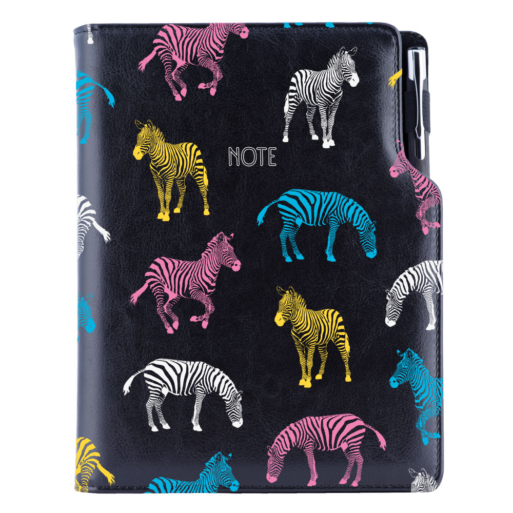 Format: A5 Block size: 143 x 206 mm Bookmark: white Paper: squared with perforation Number of pages: 144 Binding: stapled V8 Outer material: foam filling of the board covered with smooth leatherette with printed graphics Inner material: black velve