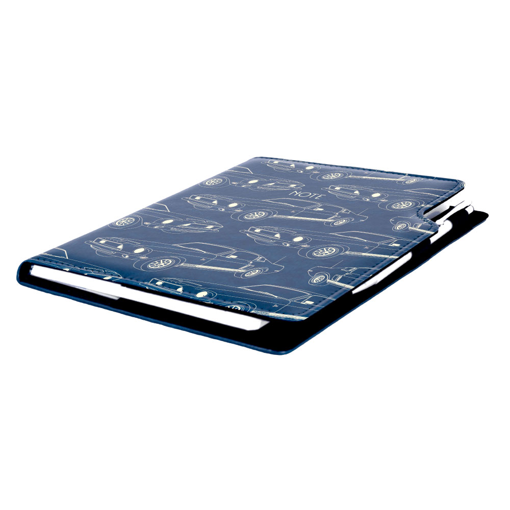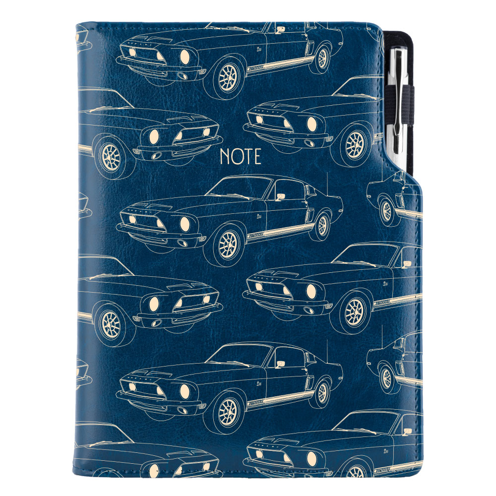 Format: A5 Block size: 143 x 206 mm Bookmark: white Paper: unlined with perforation Number of pages: 144 Binding: stapled V8 Outer material: foam filling of the board covered with smooth leatherette with printed graphics Inner material: black velv