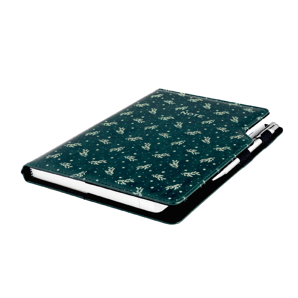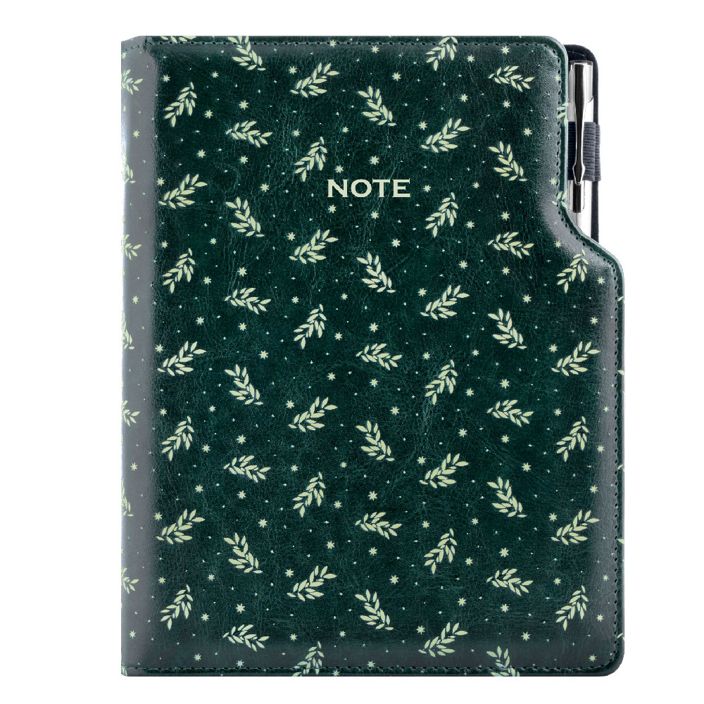 Format: B5 Block size: 170 x 240 mm Bookmark: white Paper: dotted with perforation Number of pages: 144 Binding: stapled V8 Outer material: foam filling of the board covered with smooth leatherette with printed graphics Inner material: black velve