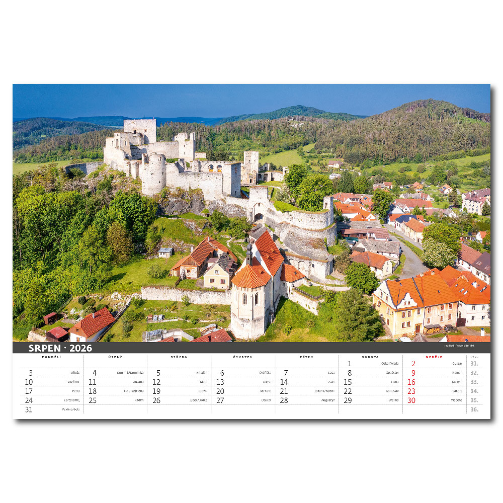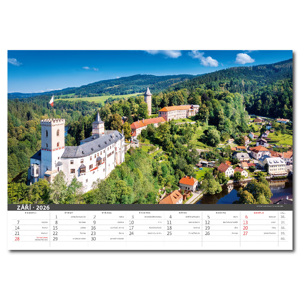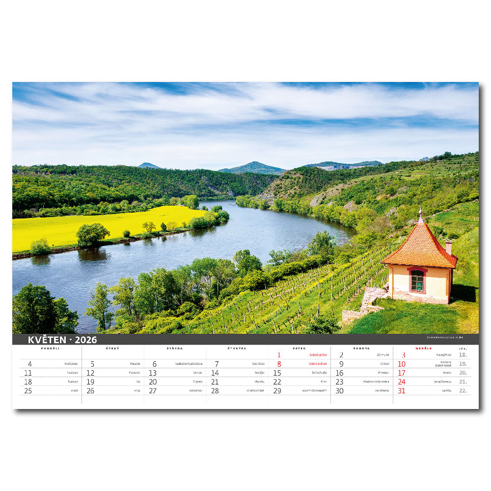 Size: 45 x 31,5 cm Calendarium: Czech monthly with names Number of Pages: 14 Pages Binding: Twin Wire Advertising space: 45 x 7 cm