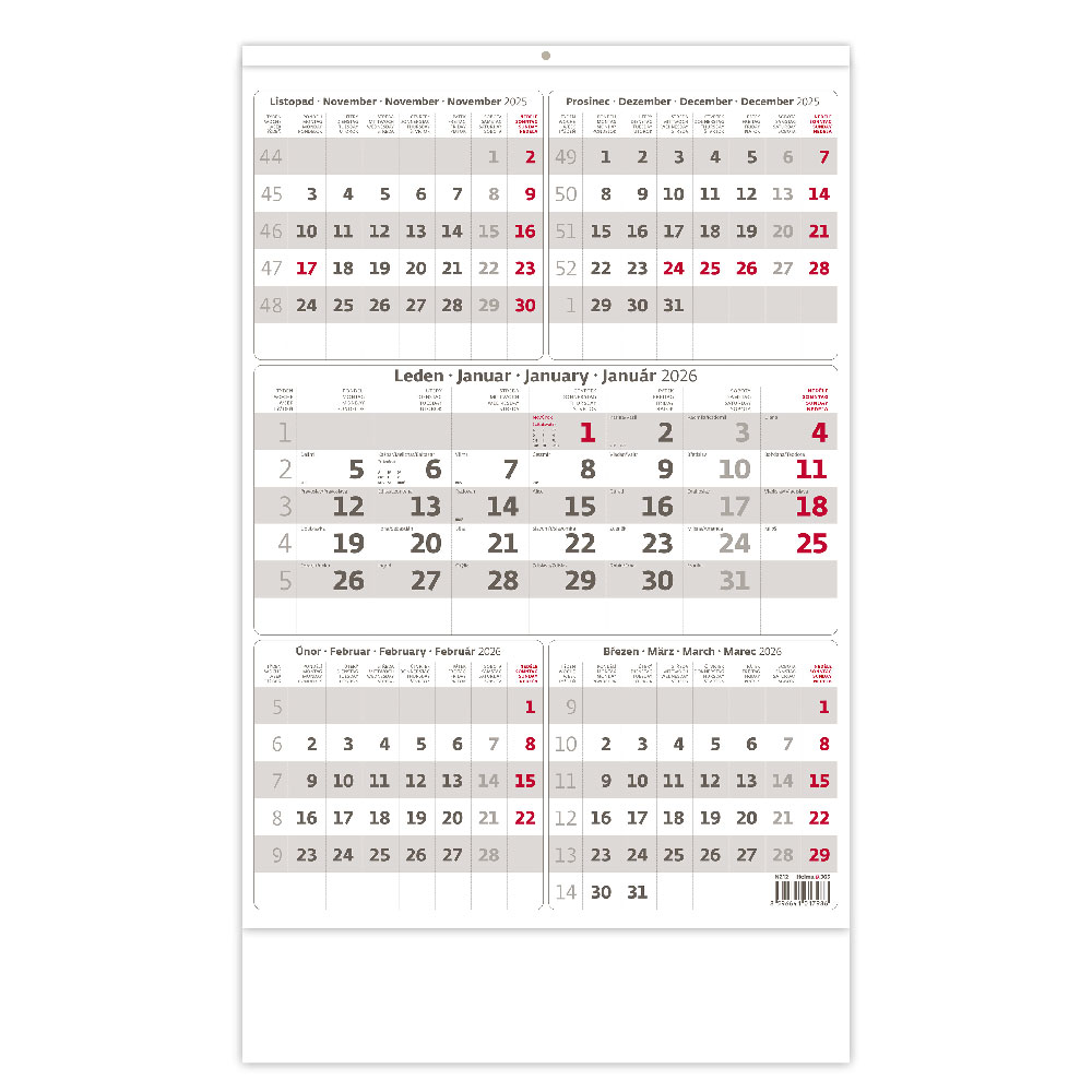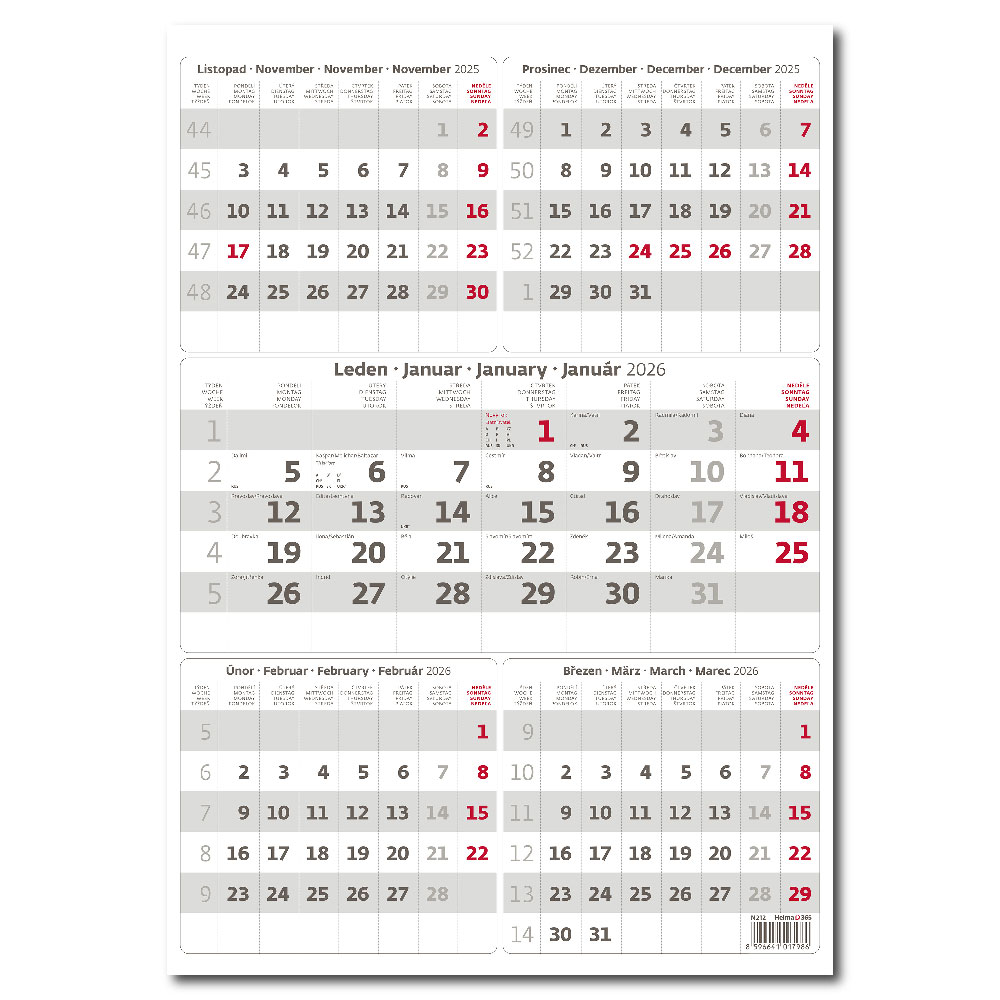 Size: 31,5 x 45 cm Calendarium: CZ 5months with European holidays Number of Pages: 12 Pages Advertising space: 31,5 x 7 cm (lower space) 31,5 x 18 cm (upper space)