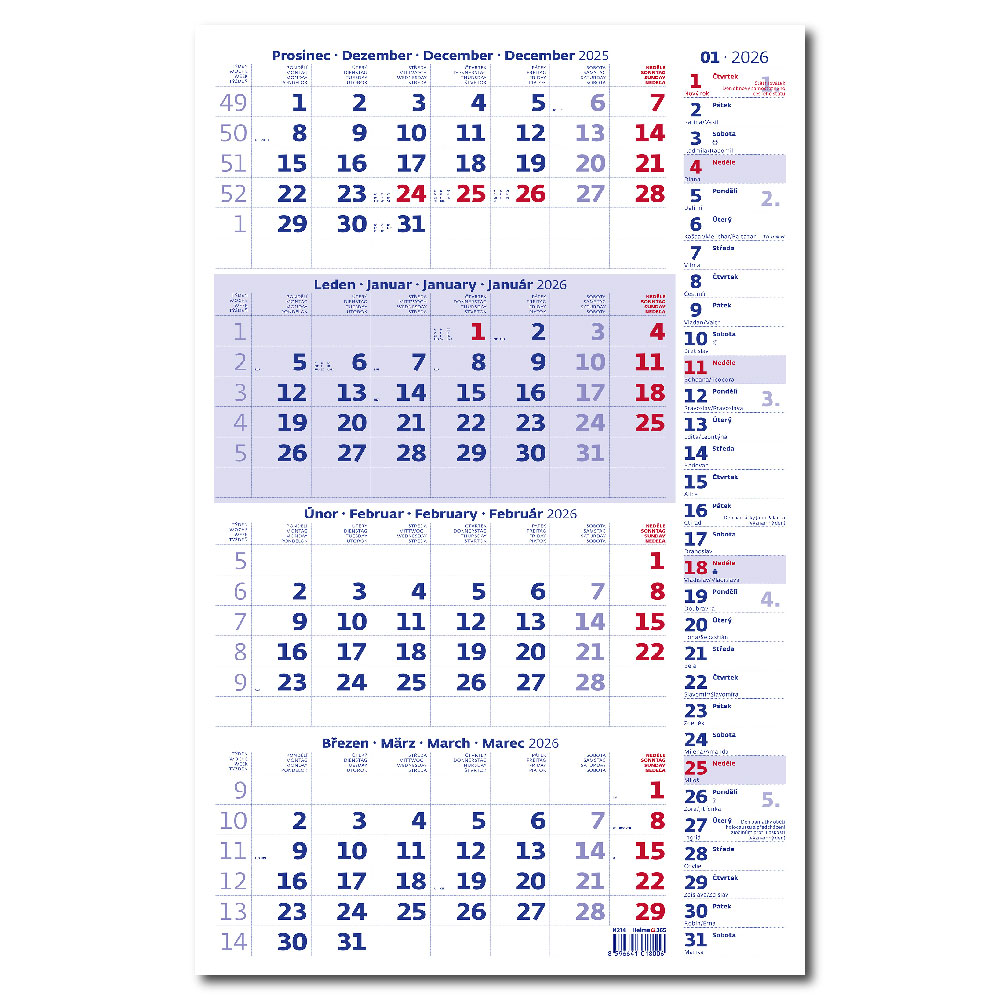 Size: 31,5 x 49 cm Calendarium: CZ 4months with European holidays Number of Pages: 12 Pages Advertising space: 31,5 x 7 cm (lower space) 31,5 x 18 cm (upper space)