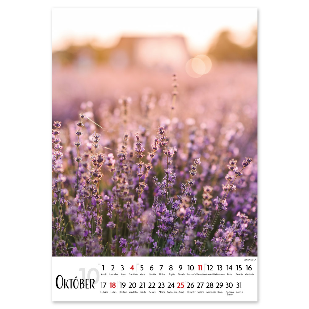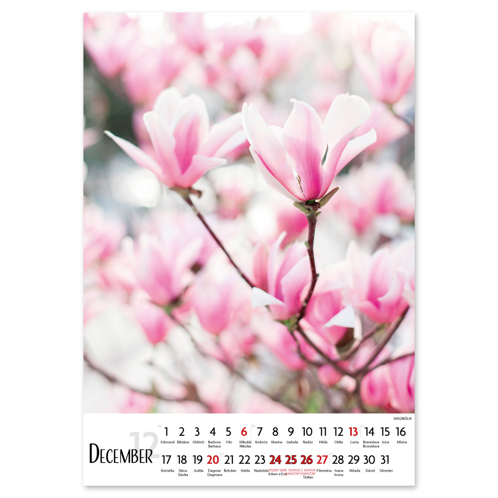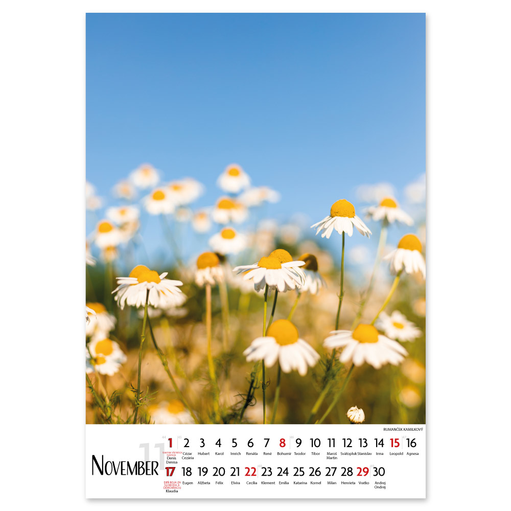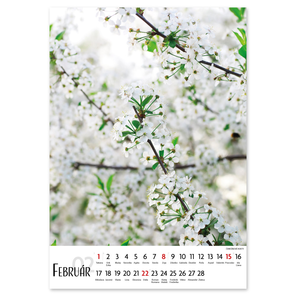 Size: 31,5 x 45 cm Calendar: Slovak with names Calendar range: 14 sheets Binding: double spiral Printable area: 31,5 x 7 cm Possibility of printing a logo on each calendar page for FREE (free from 50 pcs).