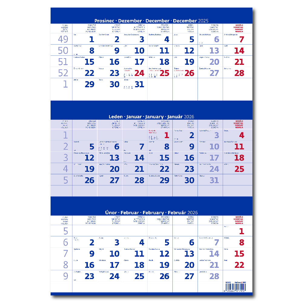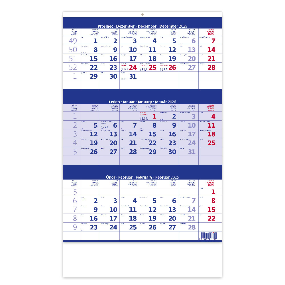 Size: 31,5 x 45 cm Calendarium: CZ 3months with European holidays Number of Pages: 12 Pages Upper Advertising space:31,5 x 18 cm Advertising space: 31,5 x 7 cm
