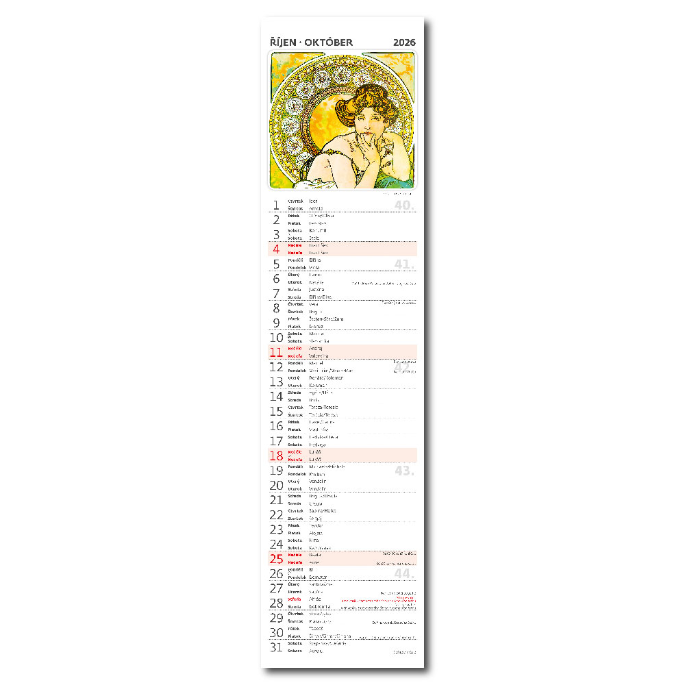 Size: 12 x 48 cm Calendarium: Czech/Slovak monthly with names Number of Pages: 13 Pages Binding: Twin wire