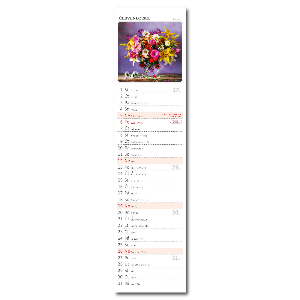Size: 12 x 48 cm Calendarium: Czech monthly with names Number of Pages: 13 Pages Binding: Twin wire