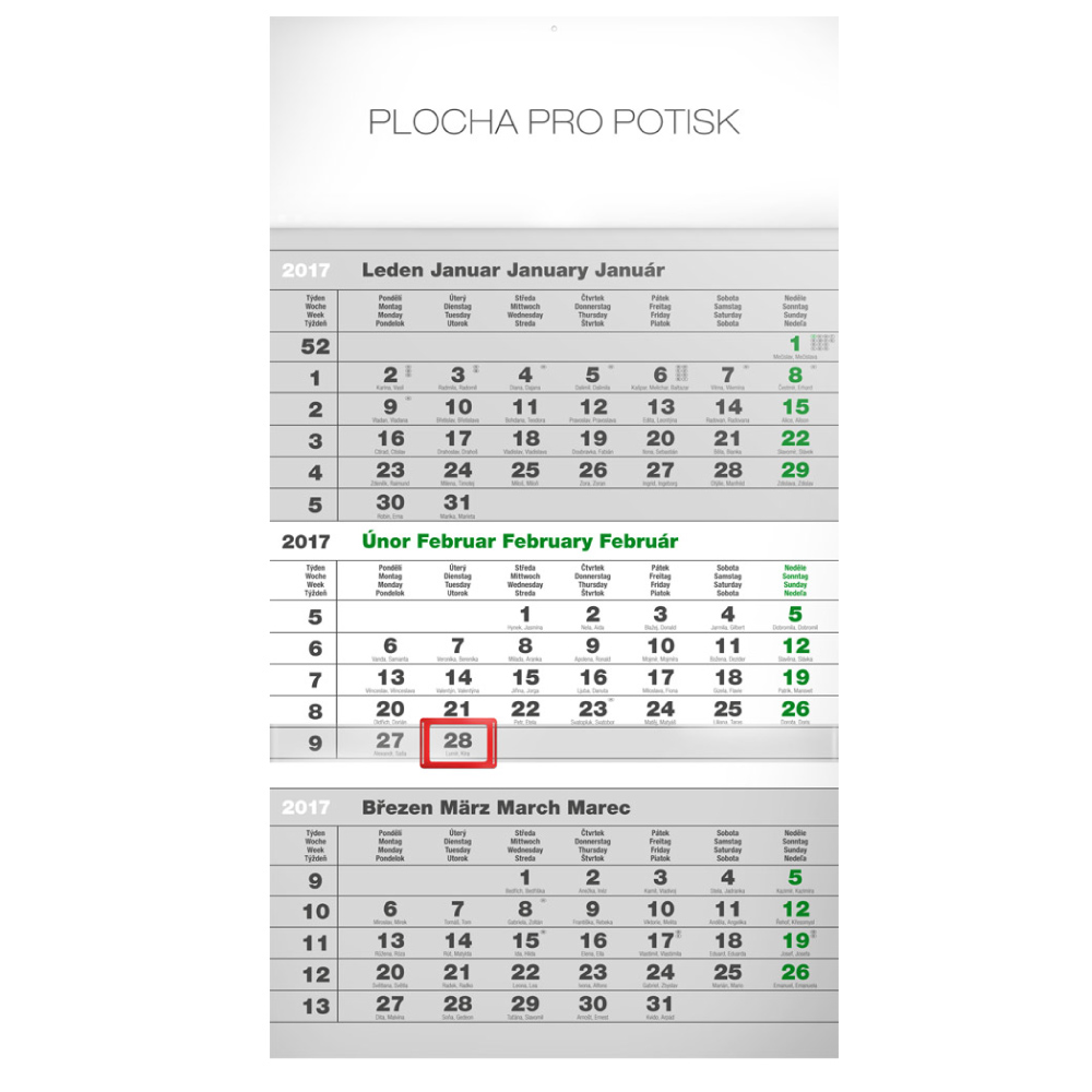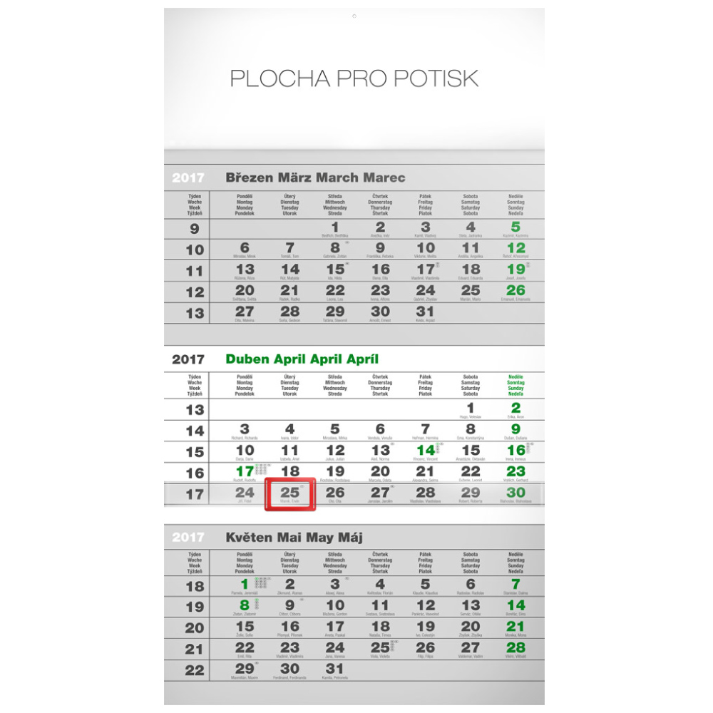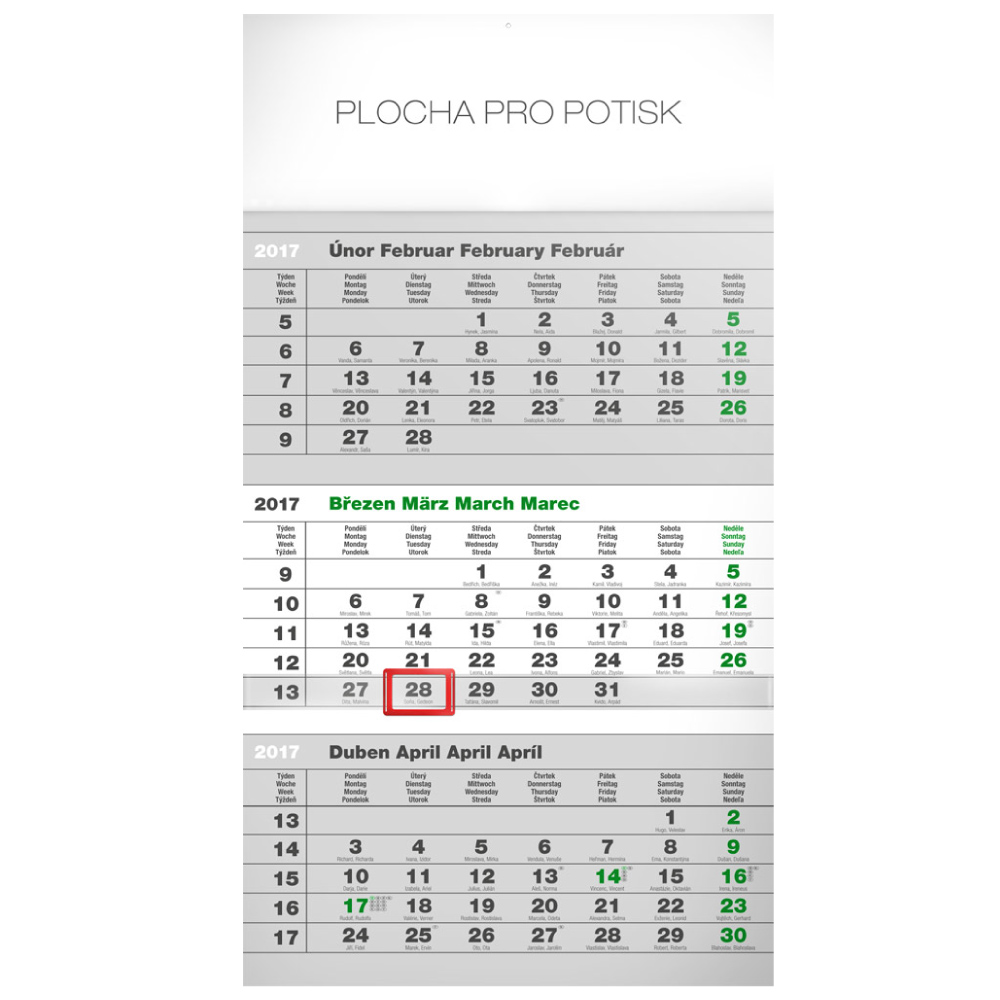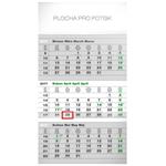 Wall Calendar ECO 3months - grey size - 29,5 x 43 cm calendarium - 4languages (CZ, SK, GB, DE) number of pages - 12 pages binding: stitched V3 paper: 120 g/m2 advertising space - upper bar 29,5 x 9 cm