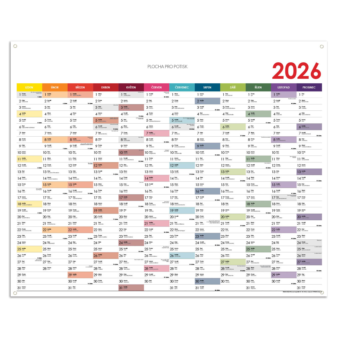 Size: 124 x 100 cm Color: color Material: washable PVC - banner Calendarium: Czech Annual with names Range: 1 paper We provide free logo printing on this calendar (from 10 pcs). Metal eyelets for hanging are included. It may be printed in full col