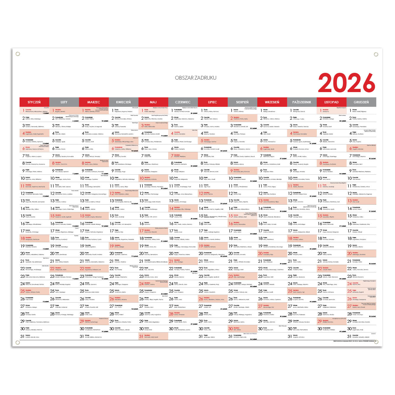 Size: 124 x 100 cm Color: red Material: washable PVC - banner Calendarium: Polish Annual with names Range: 1 paper We provide free logo printing on this calendar (from 10 pcs). Metal eyelets for hanging are included. It may be printed in full colo